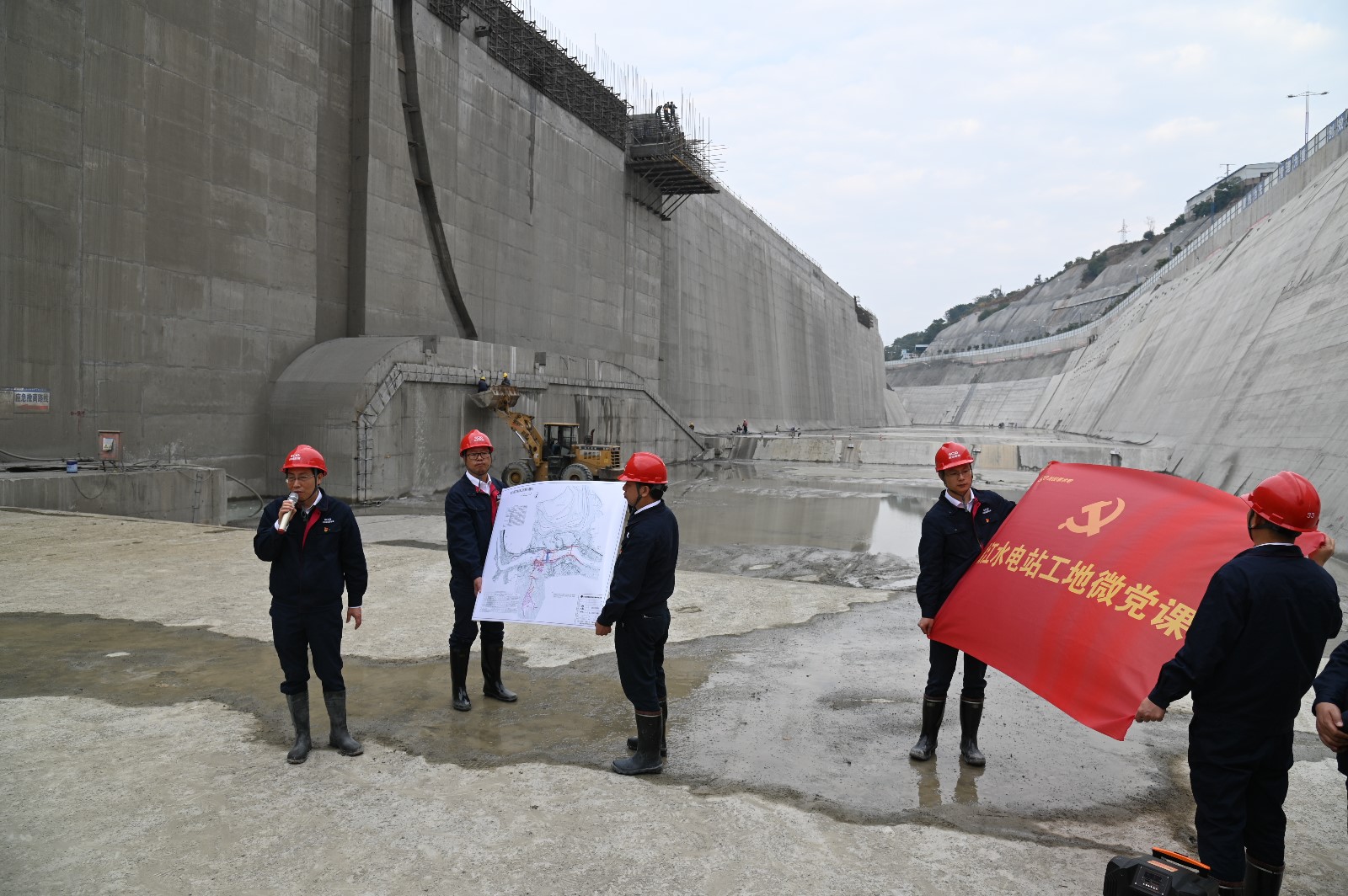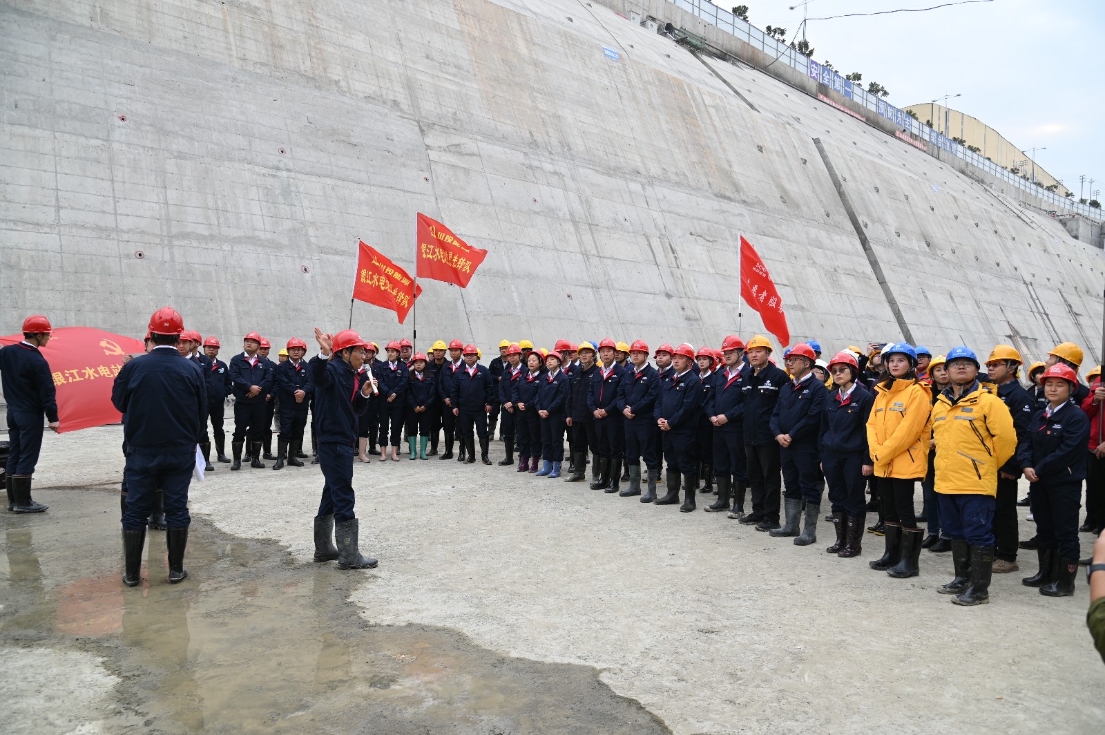 在銀江水電站導(dǎo)流明渠過(guò)流和大江截流來(lái)臨之際,為持續(xù)推進(jìn)“我為群眾辦實(shí)事”活動(dòng)走深走實(shí),不斷激勵(lì)黨員同志不忘初心、奮勇前進(jìn),12月2日,攀水電公司黨總支組織開(kāi)展了“我為銀江辦實(shí)事”主題黨日活動(dòng)。川投能源副總經(jīng)理、攀水電公司黨總支書(shū)記、董事長(zhǎng)徐孝剛在導(dǎo)流明渠基坑講授微黨課,并帶領(lǐng)大家開(kāi)展工地大掃除,公司全體黨員、職工及各參建單位聯(lián)建支部黨員共100余人參加本次活動(dòng)。