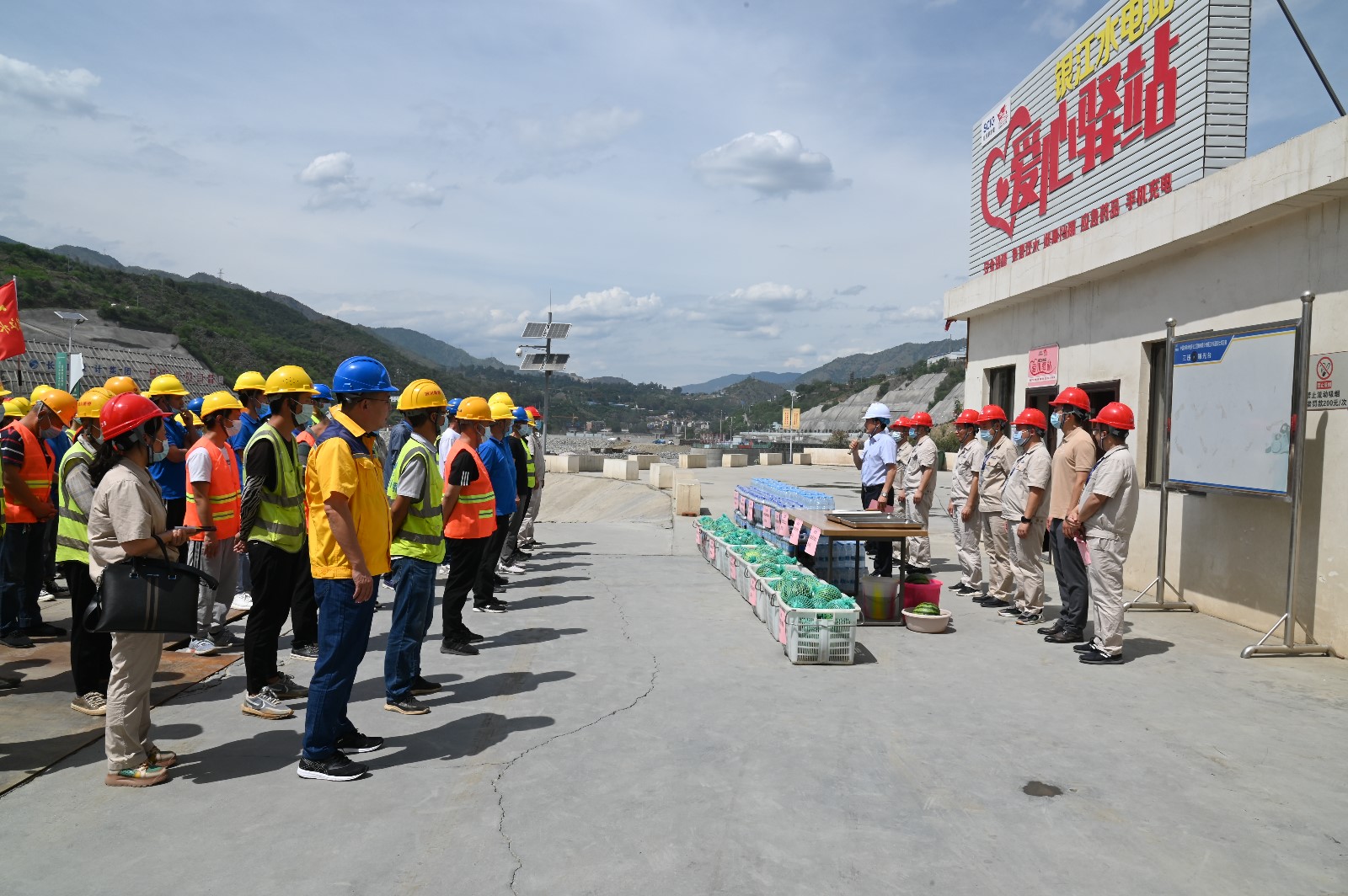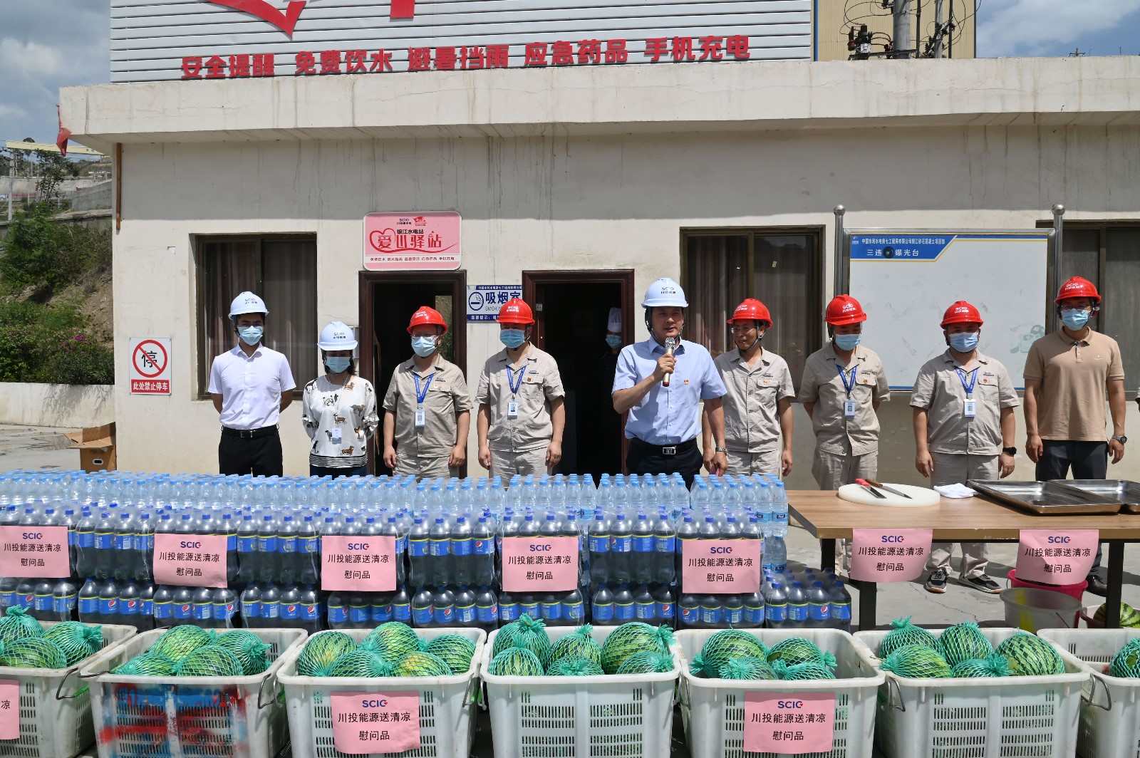 夏至剛過(guò),高溫來(lái)襲,攀枝花已進(jìn)入了高溫酷暑季節(jié)。6月22日下午,為落實(shí)全國(guó)總工會(huì)《關(guān)于做好2022年職工防暑降溫工作的通知》要求,受川投能源黨委書(shū)記、副董事長(zhǎng)、總經(jīng)理?xiàng)詈榈奈校ㄍ赌茉袋h委副書(shū)記、工會(huì)主席冉蘭平一行頂著烈日高溫,專(zhuān)程到銀江水電站工地看望慰問(wèn)堅(jiān)守在高溫酷暑中的一線(xiàn)建設(shè)者。川投能源人力資源部經(jīng)理王歆、紀(jì)檢工作部陳一鳴及攀水電公司領(lǐng)導(dǎo)、志愿者服務(wù)隊(duì)參加慰問(wèn)。