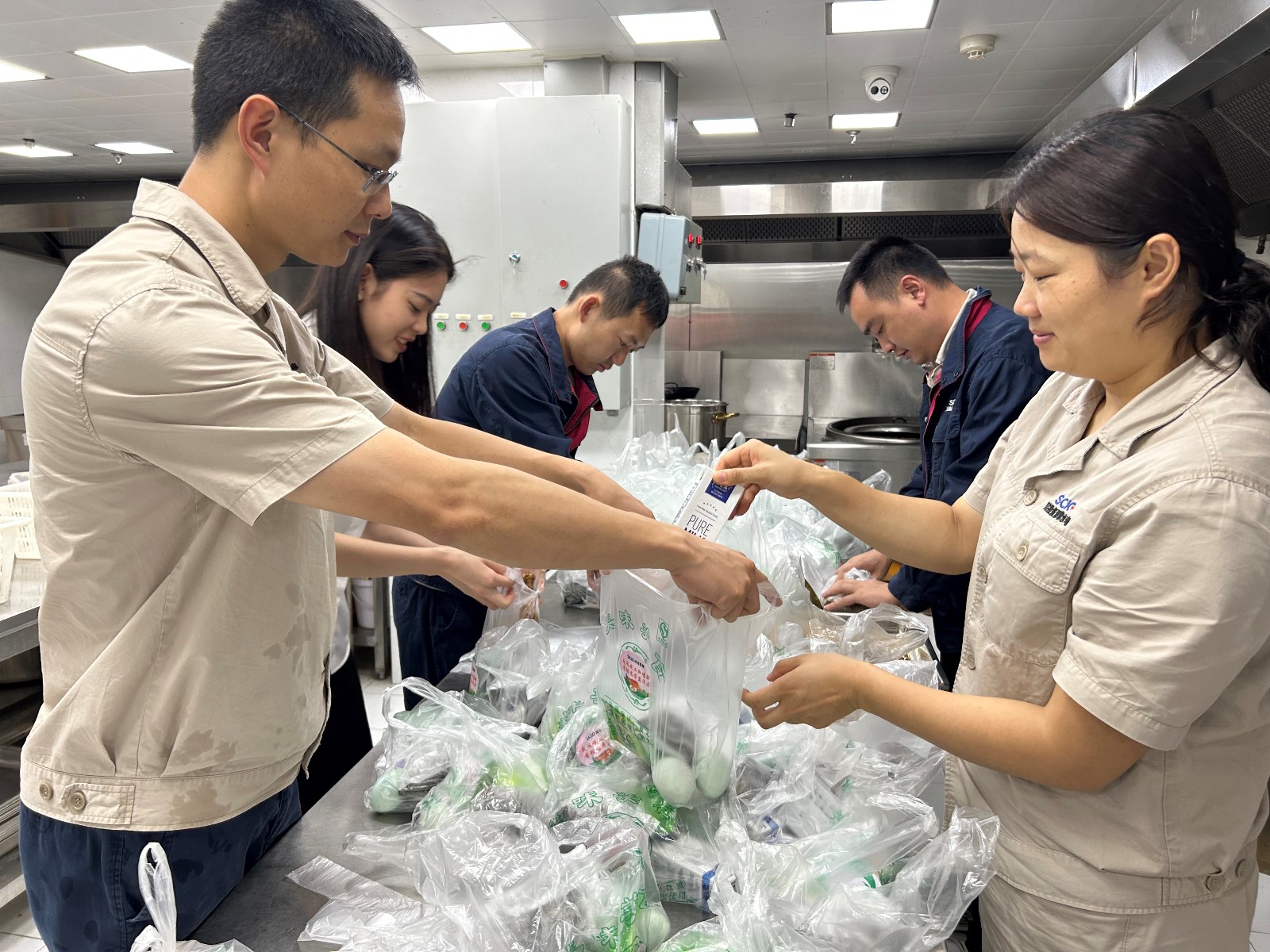 支部黨員、志愿者們放棄了難得的節(jié)日假期,下午就在職工食堂忙碌了起來,鹵雞腿,蒸粽子,煮鹽蛋,采用流水線工作方式,把熱乎乎的雞腿、粽子、鹽蛋、牛奶等提前進(jìn)行分裝,方便工友們在工地食用。