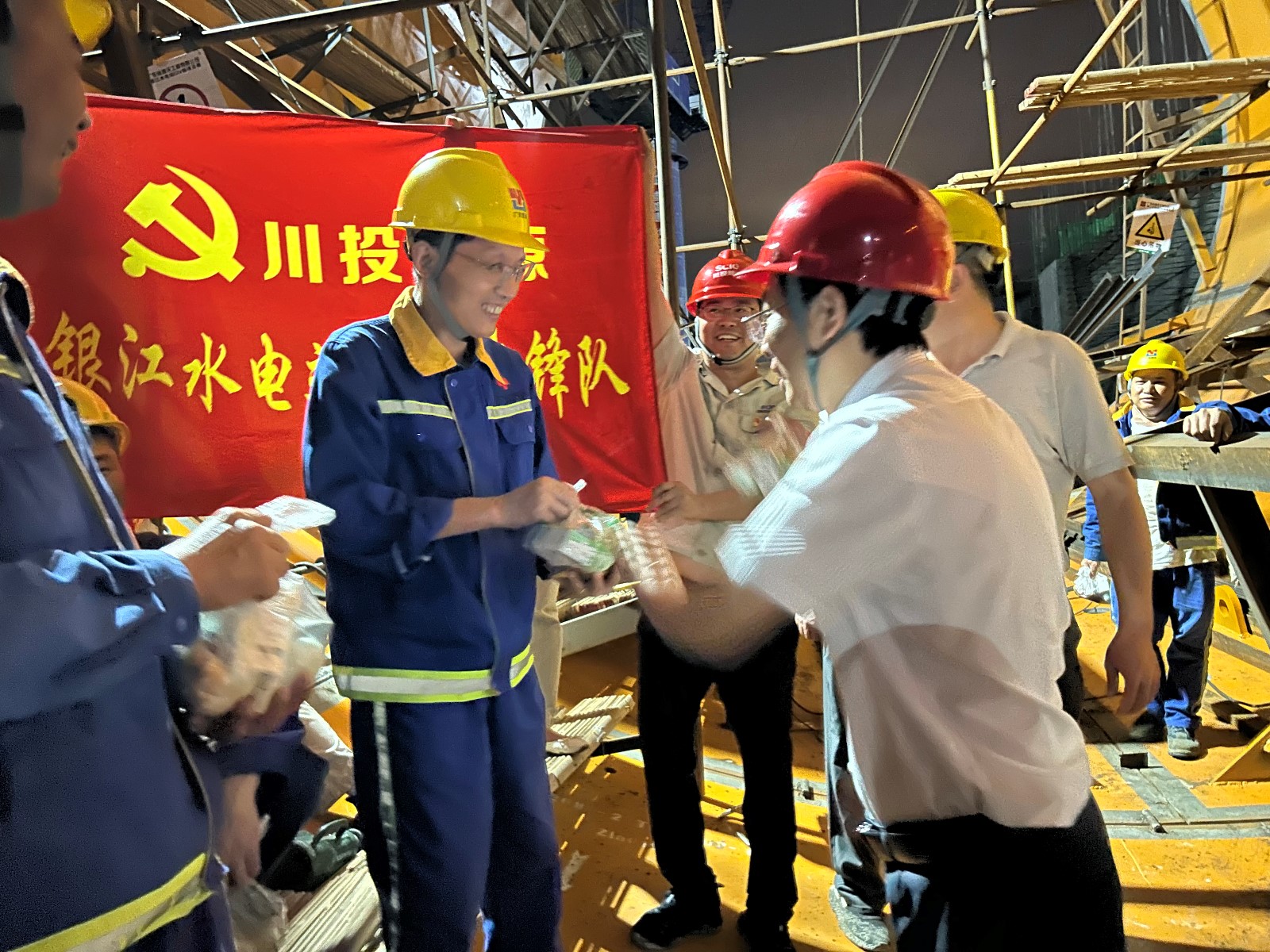 節(jié)日的銀江水電站施工現(xiàn)場,大壩混凝土澆筑、廠房尾水管機電安裝、混凝土拌和系統(tǒng)等各部位一片忙碌,為按期實現(xiàn)各項節(jié)點目標(biāo),800余名建設(shè)者依然奮戰(zhàn)在銀江水電站施工現(xiàn)場。夜晚的工地更是燈火通明,晚上九點,川投能源副總經(jīng)理,公司黨總支書記、董事長徐孝剛帶領(lǐng)公司黨員先鋒隊、志愿者服務(wù)隊,深入混凝土澆筑倉面、尾水管、拌合樓調(diào)度室、防汛值班室、變電站、保安亭等部位,將熱乎乎的雞腿、香噴噴的粽子等慰問品送到正在施工的每位工友手上。徐孝剛講到:“端午節(jié)是中華民族重要的傳統(tǒng)節(jié)日,對大家堅持奮戰(zhàn)在銀江水電站施工現(xiàn)場斗酷暑、戰(zhàn)高溫、挑燈夜戰(zhàn)表示感謝,祝福大家端午安康!”活動中,徐孝剛還開展了夜間安全檢查,叮囑大家做好防護、確保施工安全。