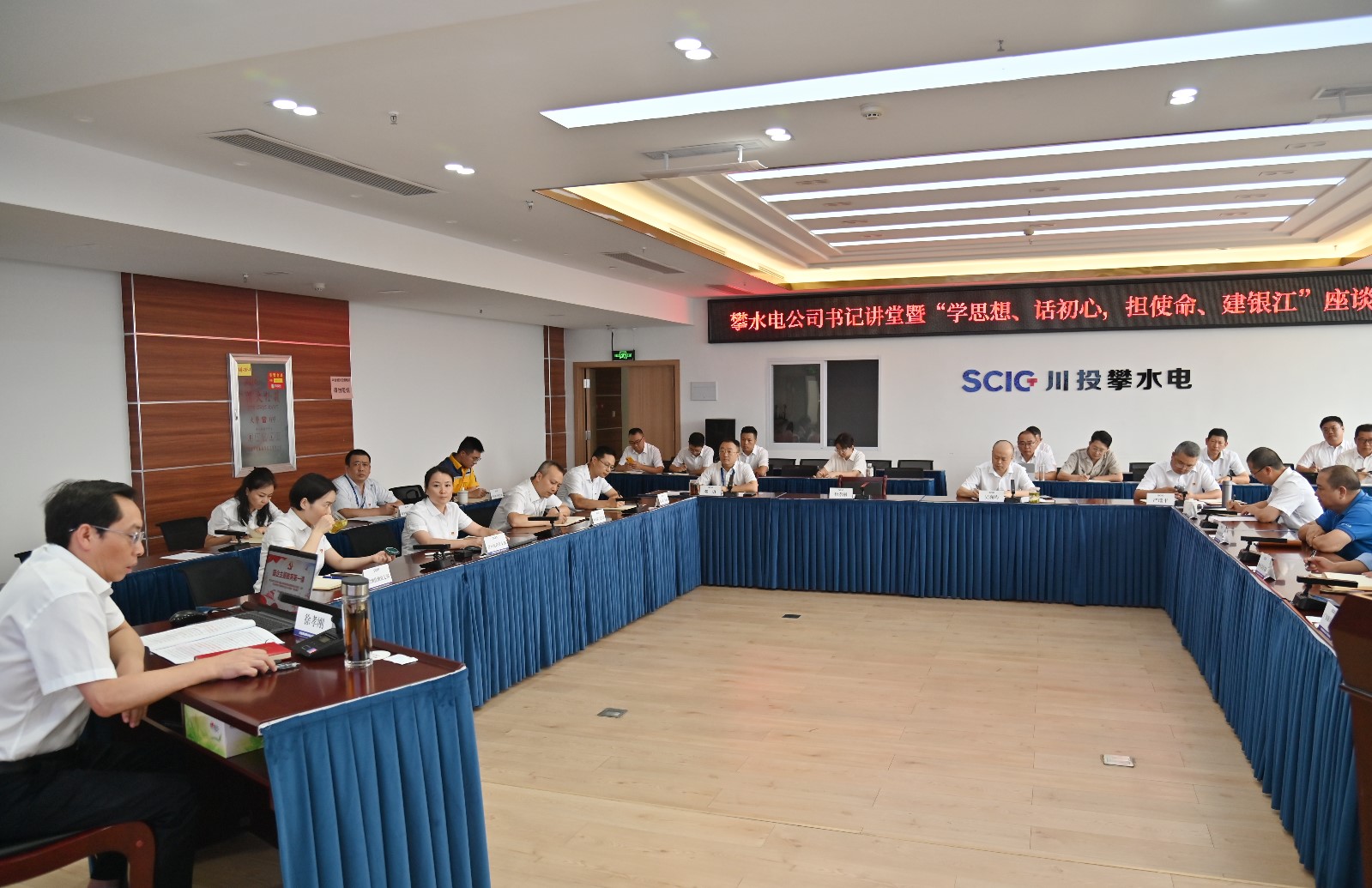 為扎實(shí)推進(jìn)學(xué)習(xí)貫徹習(xí)近平新時(shí)代中國(guó)特色社會(huì)主義思想主題教育走深走實(shí),以思想偉力凝聚起干事創(chuàng)業(yè)的強(qiáng)大動(dòng)力,7月8日,攀水電黨總支組織開展書記講堂暨“學(xué)思想、話初心,擔(dān)使命、建銀江”座談會(huì),由川投能源副總經(jīng)理、攀水電黨總支書記、董事長(zhǎng)徐孝剛講授專題黨課,公司全體黨員、非黨中干、統(tǒng)戰(zhàn)對(duì)象、青年職工,聯(lián)建支部書記、黨員代表共計(jì)40余人參加。