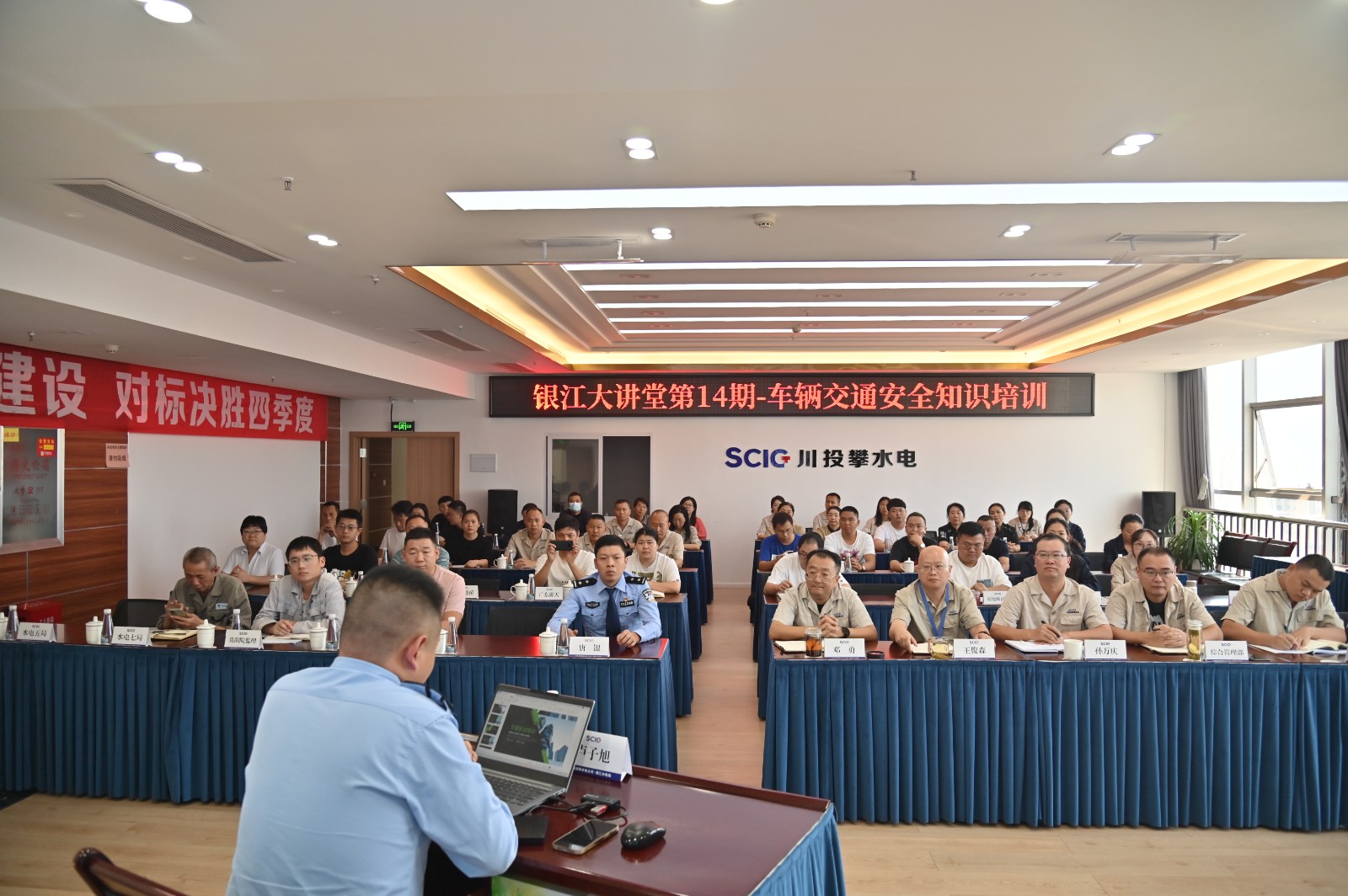 為全面做好銀江水電站安全生產(chǎn)各項(xiàng)工作,強(qiáng)化各單位安全生產(chǎn)工作主體責(zé)任意識,切實(shí)做好車輛交通安全管理工作,10月23日,攀水電公司舉辦2023年第14期“銀江大講堂”——車輛交通安全專題培訓(xùn),邀請攀枝花市交警支隊(duì)三大隊(duì)事故民警唐銀、宣傳民警盧子旭主講,公司在攀領(lǐng)導(dǎo)、各部門員工、各參建單位有關(guān)管理人員及駕駛員共計(jì)50余人參加。