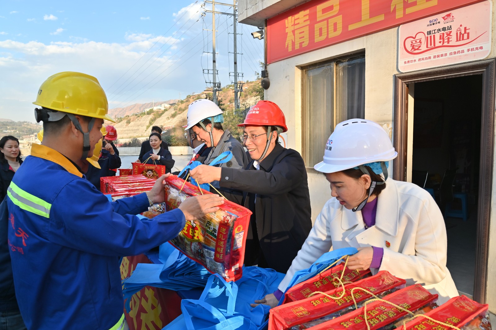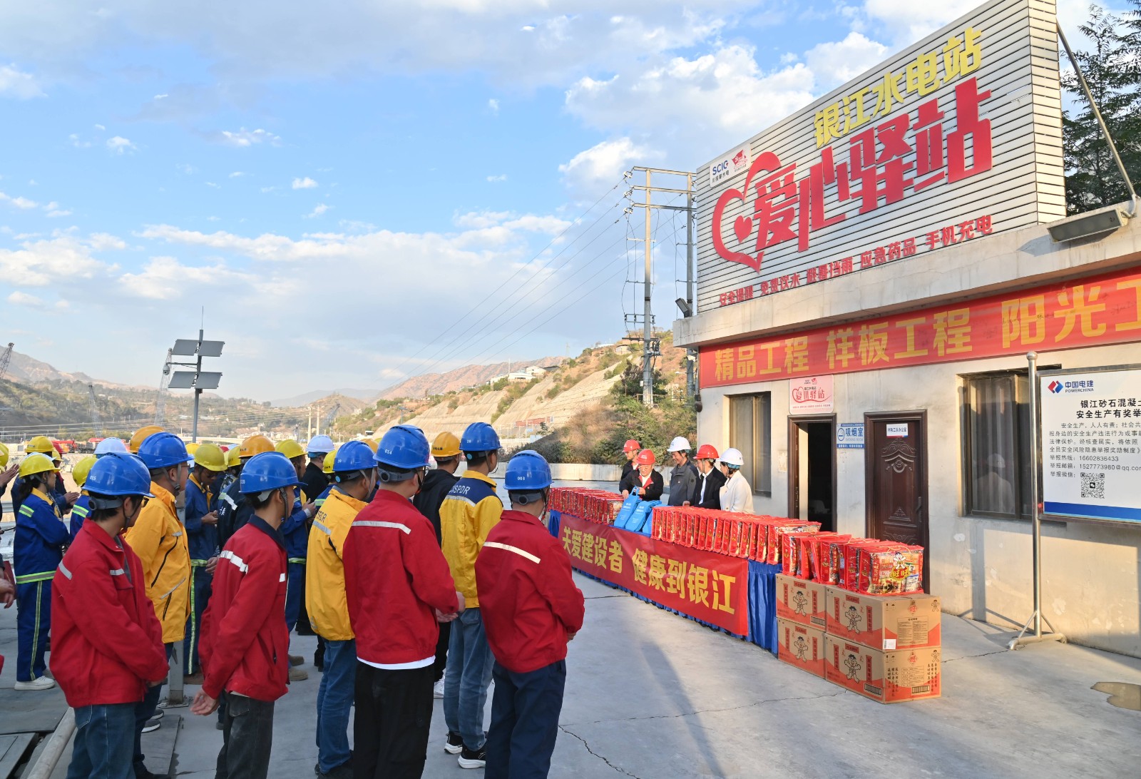 活動(dòng)首先參觀了公司大黨建宣傳陣地和銀江水電站施工現(xiàn)場。在愛心驛站,黨員們?yōu)閬碜蚤L江設(shè)計(jì)院、貴陽院監(jiān)理部、水電五局項(xiàng)目部、水電七局項(xiàng)目部、廣東源天項(xiàng)目部等參建單位的工友發(fā)放了健康宣傳手冊、新春大禮包等慰問物品。田巨龍感慨到銀江水電站工程建設(shè)速度之快難以令人想象,囑咐工友們一定要保重身體、注意自身防護(hù),祝福工友們平平安安、健健康康迎接新年的到來。
