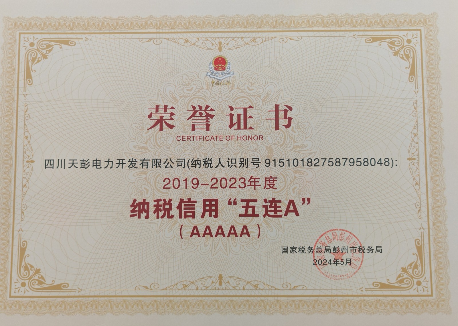 6月11日,天彭電力喜獲殊榮:國(guó)家稅務(wù)總局彭州市稅務(wù)局向我公司授予了“彭州市‘2019-2023年度納稅信用五連A’”榮譽(yù)證書,這是稅務(wù)機(jī)關(guān)對(duì)我公司誠(chéng)信納稅、守法經(jīng)營(yíng)的肯定和表彰。
