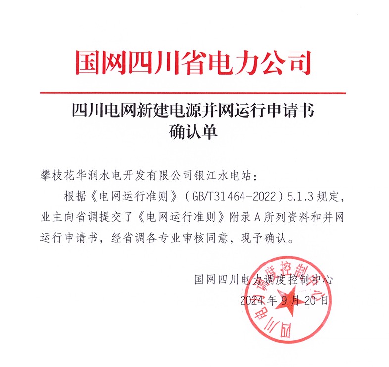 9月20日,在國(guó)網(wǎng)四川省電力公司和川投能源的指導(dǎo)幫助下,經(jīng)過(guò)積極對(duì)接、多方協(xié)調(diào),攀水電公司成功取得銀江水電站新建電源并網(wǎng)運(yùn)行申請(qǐng)書確認(rèn)單,標(biāo)志著銀江水電站具備并網(wǎng)手續(xù)辦理的資格條件。